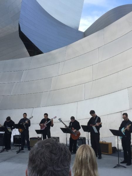 LA Times’ Mark Swed called Circle Limit III “…a stunning wall of sound as aural complement to Gehry’s steel, ” and Sequenza 21 said “ … Circle Limit III, by Daniel Corral, gracefully flowed outward in a warm ambient wash. The piece was never static… with the sound rising, falling and slowly shimmering in the bright afternoon sunshine. The harmonies were lush and comforting and… Circle Limit III was perfectly chosen for the sidewalk and fully captured the imagination of the crowd…”